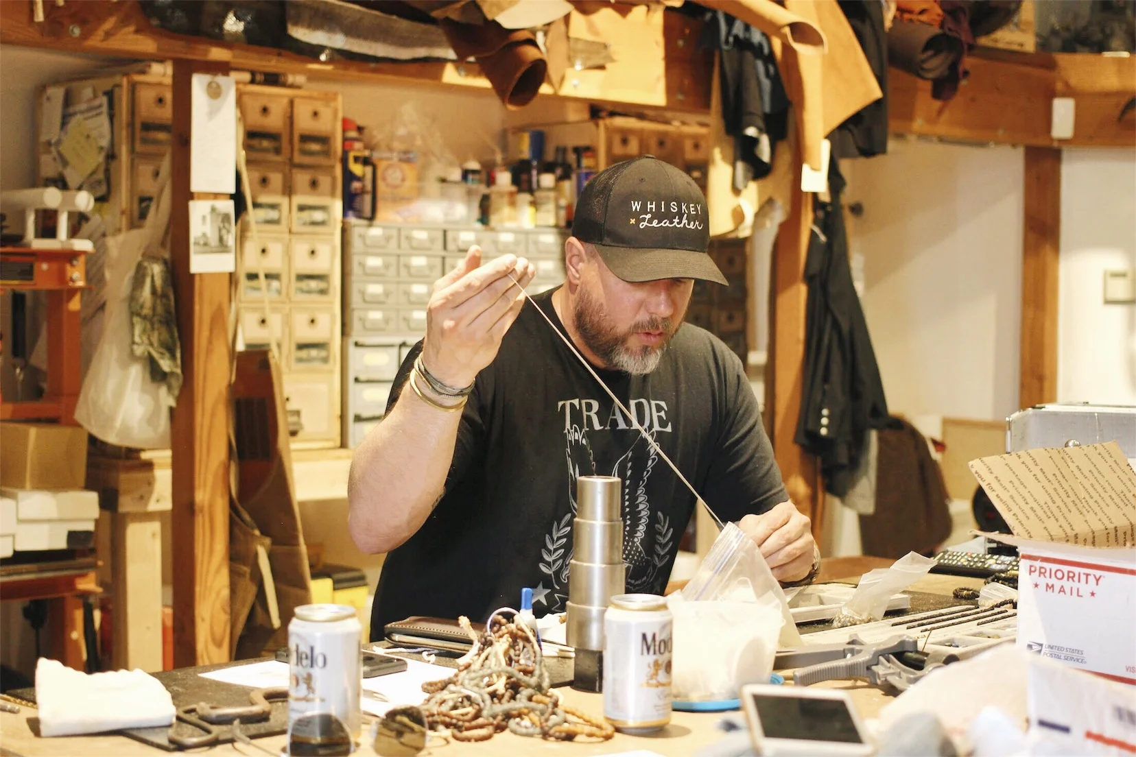 When Aaron Boyd invited us into his Baca District leather workshop, it felt like we stepped onto a movie set. Vintage road signs and taxidermy hung on the walls, rolls and rolls of cow hides were stacked high on shelf, and a “Liberty or Death” pennant flag hung prominently on the wall. In the corner, a big metal bucket was overflowing with leather scraps and his shelves were full of vintage metal tools and supplies. He played with the brass bullet casings scattered across his work table as he began to speak to us.