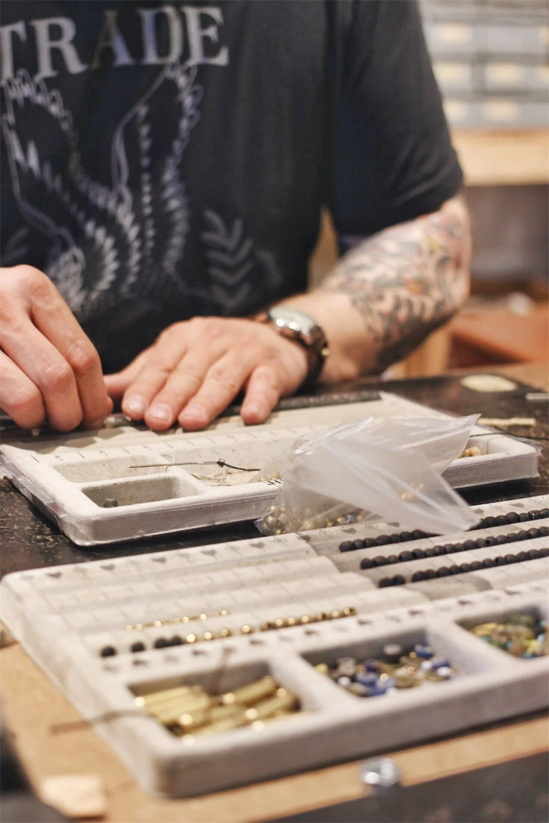 During the course of this interview, Aaron made us a few products to take home. He created two bead & leather bracelets, leather coasters, and invited us back to his workshop for more. To see him create these products by hand - slipping each bead on the string, sewing the leather clasps, burning the thread, hand pressing the coasters - was a beautiful show of the craftsmanship and thought that go into his products. To see for yourself, visit his website or shop to browse his handmade leather goods.